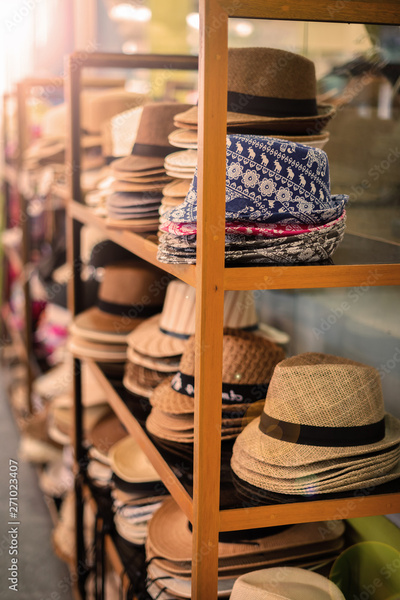 many summer hats and Panama hats lie on the counter in the shop for tourists. Summer, Thailand.