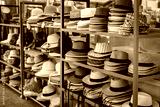 many summer hats and Panama hats lie on the counter in the shop for tourists. Summer, Thailand.