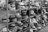 many summer hats and Panama hats lie on the counter in the shop for tourists. Summer, Thailand.