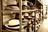 many summer hats and Panama hats lie on the counter in the shop for tourists. Summer, Thailand.