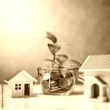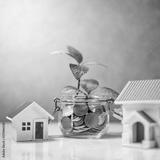 Property or real estate investment. Home mortgage loan rate. Saving money for future concept. Reflection of green plant growing out of coins in glass jar and house model on the table