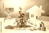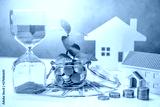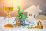 Real estate investment or property ladder. Home mortgage loan rate. Saving money for future concept. Plant growing out of coins in glass jar with dollar banknotes, hourglass and house model on table