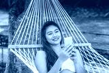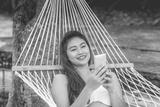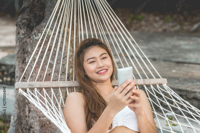 Summer Vacation of happy Asian woman wearing white bikini using mobile phone relax and lying in hammock on tropical island beach in Thailand,Travel in Thailand Destination,Summer vacations Concept