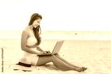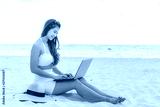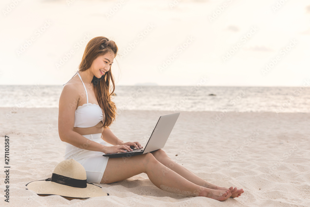 Cute Asian woman working with computer laptop on the tropical island beach with sunset feeling so happiness and comfortable,Summer Vacations and Freelance concept