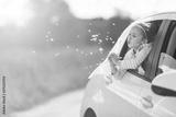 Family travel concept by car. Happy smiling child girl blowing dandelion flower from the car window. Summer background.