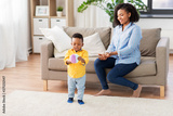 childhood, kids and people concept - happy african american mother and her baby son playing with ball together on sofa at home
