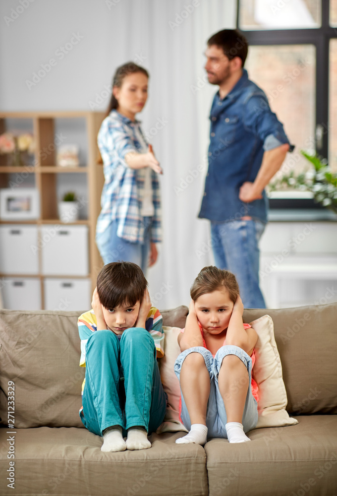 family problem, conflict and people concept - sad children closing ears while their parents quarreling at home