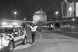 Aviation marshall supervisor meets passenger airplane at the airport at night view. Aircraft is taxiing to the parking place. Ground Crew in the signal vest.