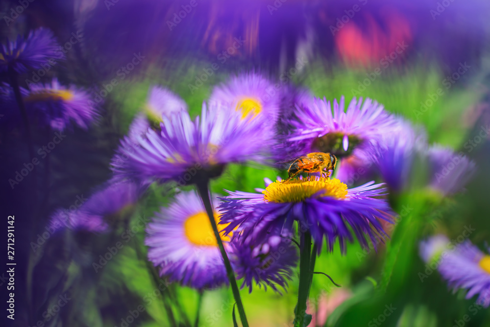 Honey bee on blue aster flowe in garden
