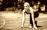 Athlete woman in starting run position. Sport, fitness, athletics concept