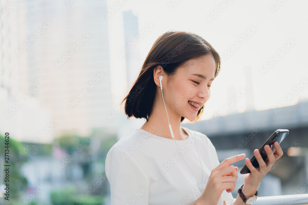 Women are listening to music from white headphones. And using hands touch to use various functions, happy mood.
