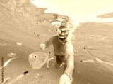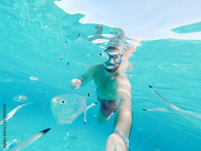 Young man swims in the sea with fish - Millennial does snorkeling in the ocean in the summer
