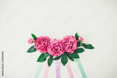 Layout with peony flowers composition with pastel colors ribbons on a white background. Love, Wedding. Festive Floral mockup. Greeting card. Flat lay, top view. Vintage, retro toning. Copy space.