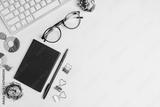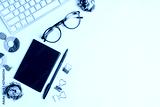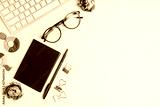 Female work place with computer keyboard, notebook, pen, glasses and flowers