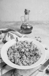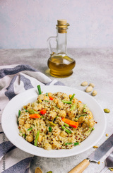 chickpea and quinoa salad with cashews, raisins, green onions and carrots