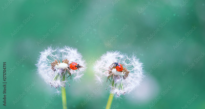 two ladybugs on white fluffy dandelions. beautiful green outdoors scene with lovely ladybugs in summer nature close up. Gentle artistic image of wildlife insects. copy space