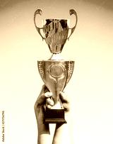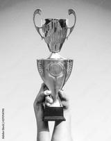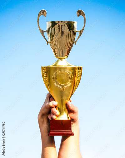 Winner, win, champions cup, prize. Winners holding champion golden trophies. Hand of the person with a sports trophy. Gold trophy cup as a winner. Professional champion. Winners team, award.