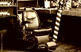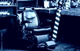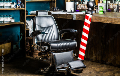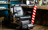 Barber shop chair. Barbershop armchair, barber shop for men. Barber shop pole. Logo of the barbershop, symbol. Stylish vintage barber chair. Hairstylist in barbershop interior