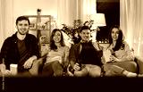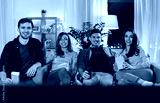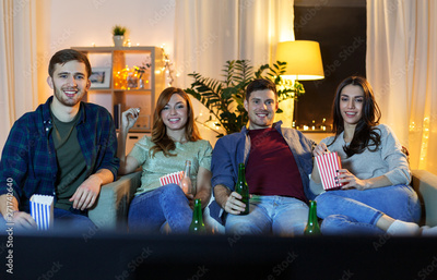 friendship and leisure concept - happy friends with beer and popcorn watching tv at home at night