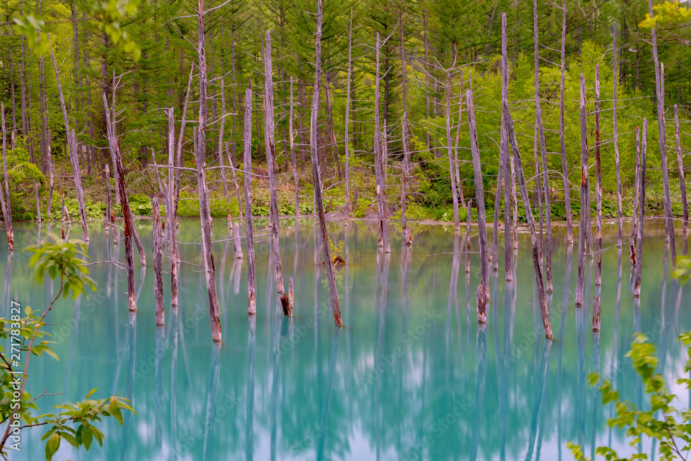 Blue pond (Aoiike) with reflection of tree in summer, located near Shirogane Onsen in Biei Town, Hokkaido, Japan