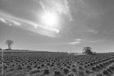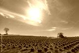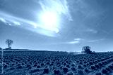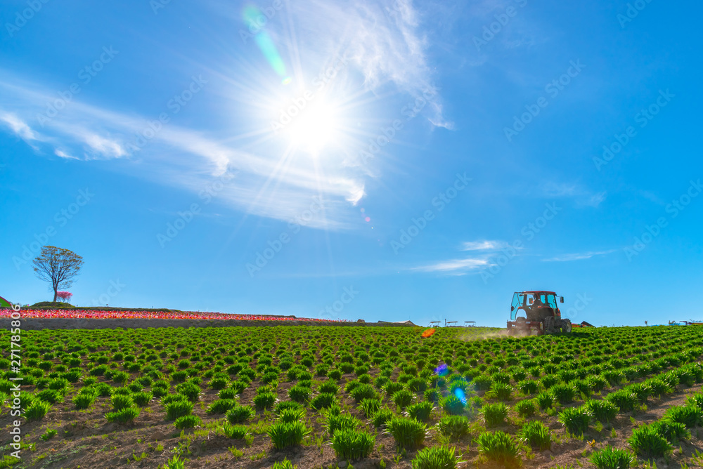 View of a tractor and planting implement cultivating flower field in a beautiful sunny day in springtime.