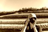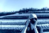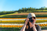 Close-up a Young Japanese girl holding a digital camera and taking photo in a colorful flowers field in summer sunny day at Shikisai-no-oka, popular spot for sightseeing in Biei Town, Hokkaido, Japan
