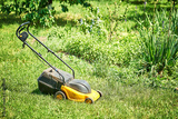 Lawn mower on green grass, against a background of trees and a fence, in the yard.