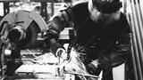 Heavy industry worker cutting steel with grinder machine in industrial manufacture, black and white