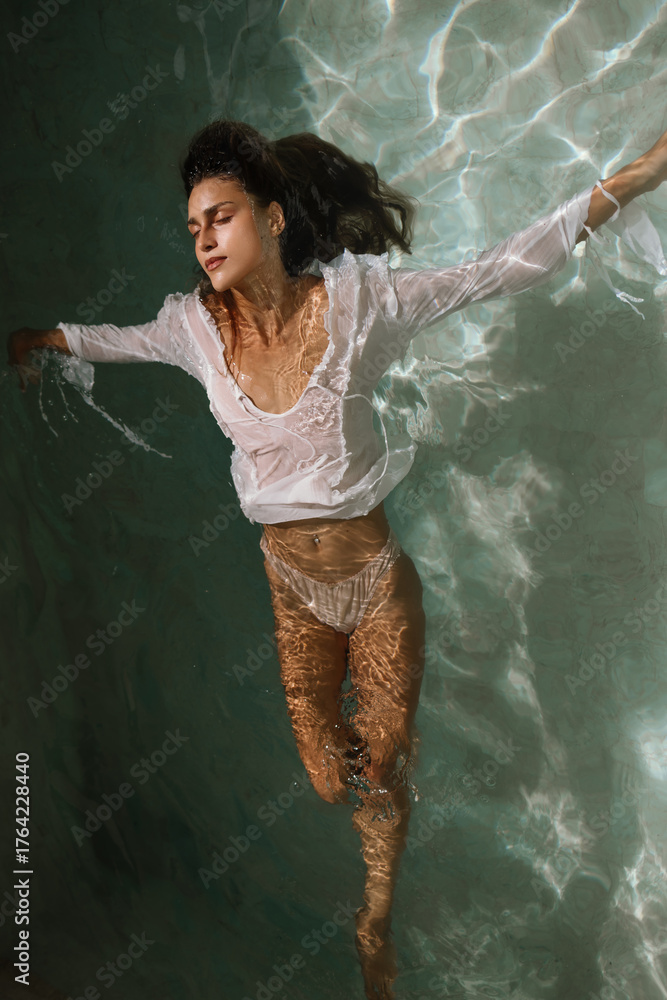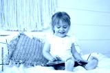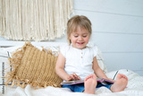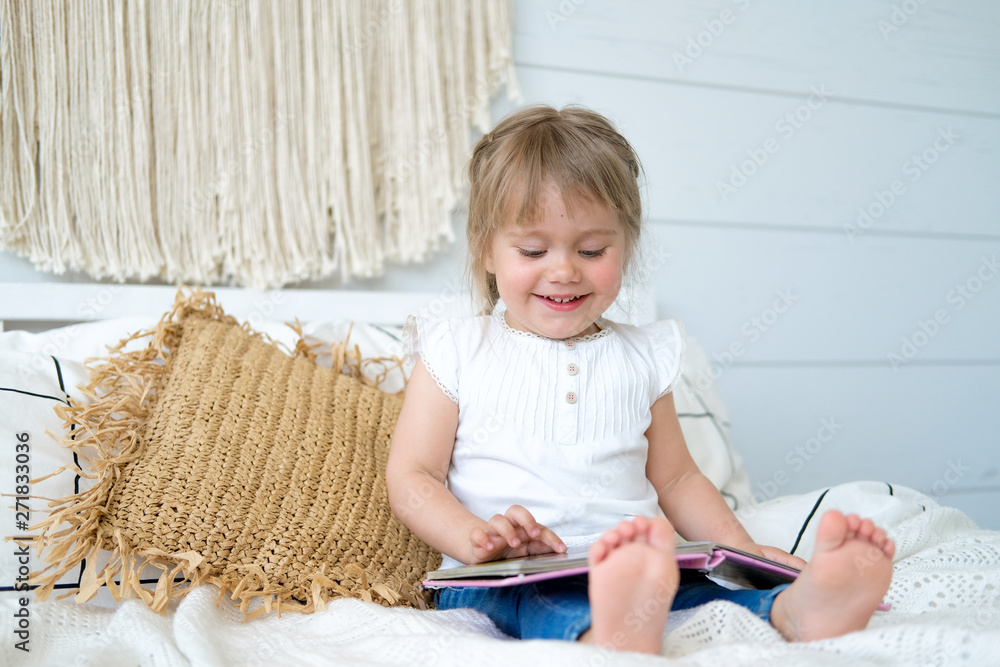 Beautiful little girl sitting on the bed and reading a book. The baby has blonde hair and blue eyes. White bedroom, cozy house. Teaching children to read.