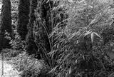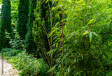 Tall elegant bamboo Phyllostachys aureosulcata bush fits perfectly into design of beautiful ornamental garden. Great combination with yew and thujas. Nature concept for design