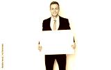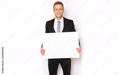 Elegant man in suit holding a banner.