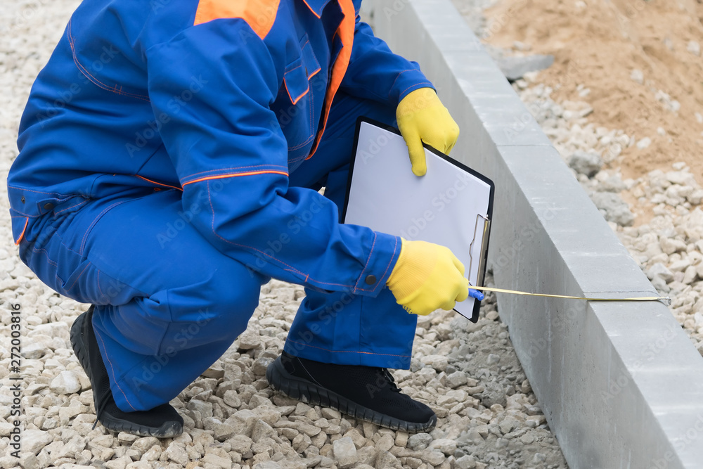 the worker of the quality and control department checks with the help of a tape measure compliance with the requirements of road size standards