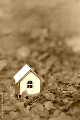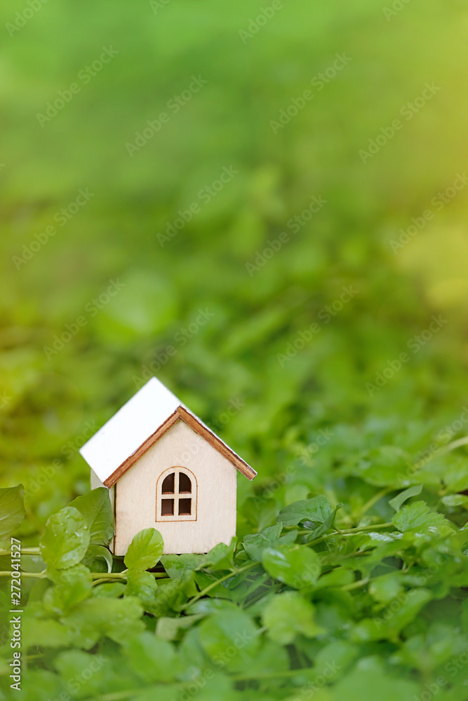toy wooden house in green grass background. Symbol of happiness, family, Mortgage, Real estate concept. Eco Friendly House, Eco home. Home sweet home. copy space