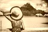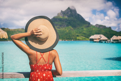 Beach vacation travel getaway summer holiday woman looking at view of Mt Otemanu on Bora Bora luxury hotel on romantic honeymoon. Tourist holding hat from behind enjoying Tahiti, French Polynesia.