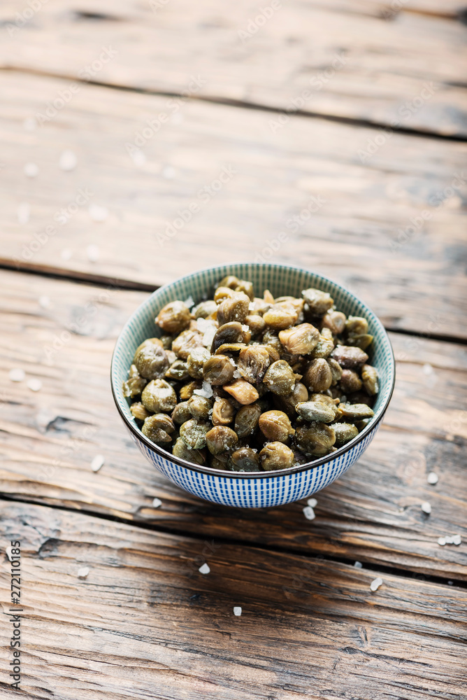 Salt capers on the wooden table