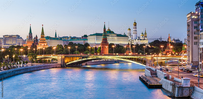 Moscow Kremlin at Moskva River, Russia. Beautiful view of the famous Moscow city center in summer. Panorama of old Moscow Kremlin and Bolshoy Kamenny Bridge at dusk. Moscow cityscape in evening.