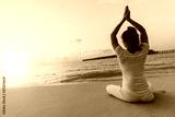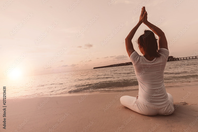 Asian woman wearing white sportswear practicing yoga Lotus pose to meditation on the beach in Maldives at sunset,Feeling so comfortable and relax in holiday,Healthy Concept,Warm tone