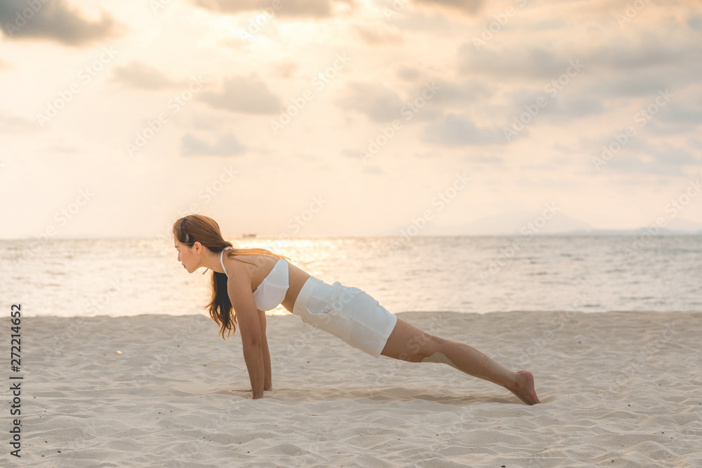 Asian young woman practice yoga Plank or Phalakasana Pose on the sand and beach with sunset beautiful sea in Tropical island,Feeling comfortable and relax in holiday,Vacations Yoga Concept