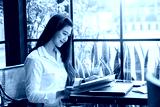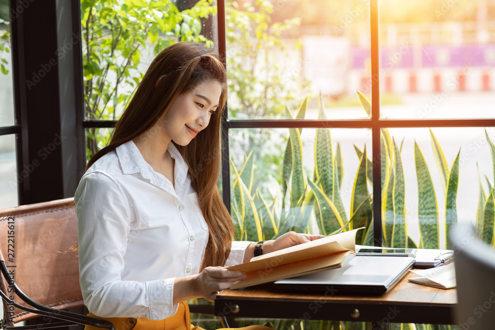 Beautiful Attractive Asian woman reading book for learn and education smile and positive thinking feeling so happiness and comfortable,Education Concept