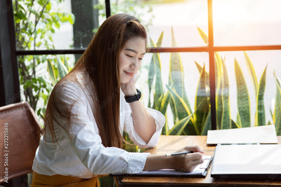 Beautiful Attractive Asian woman working with laptop smile and writing idea and requirement for success job outside office in coffee shop,Business Concept,Warm Tone