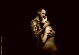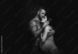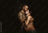 Couple in love pregnant cuddling, waiting for baby. Real romantic passionate moment. Bearded man with tattoo clasping beautiful girlfriend. Emotive of sexy couple.