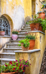Old narrow street in Plaka district, Athens, Greece. Plaka is a famous tourist attraction of Athens. Vintage steps with flowers. Beautiful stair of cozy alley on Acropolis slope in the Athens center.
