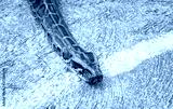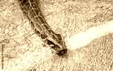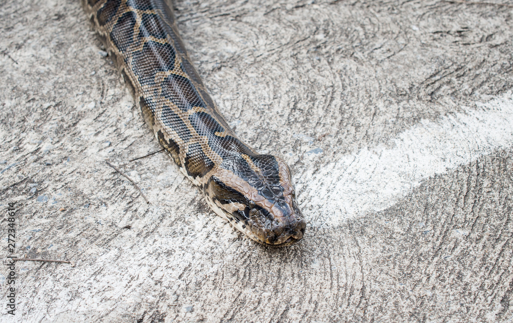 Close-up of Burmese Python crawling on the cement floor.Python is a genus of nonvenomous snakes.