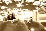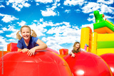 Happy little girls having lots of fun while jumping from ball to ball on an inflate house.