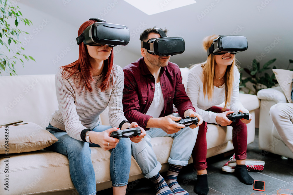 Young group of people having fun with virtual reality - Two women and a man are using VR glasses at home - They play with a joystick to a video game