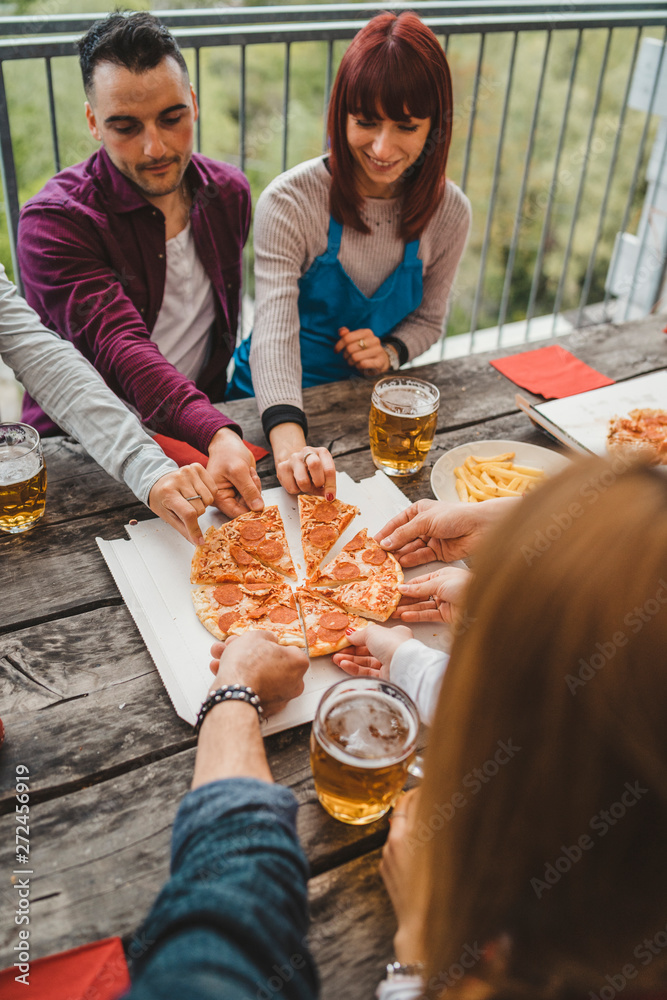 Group of friends eating pizza - Millennials have fun together - Day of happiness between young men and women