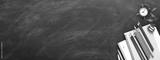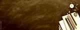 School stationary on chalkboard. Notebooks, pens, pencils, alarm clock, red apple and other tools. Banner with place for text.