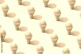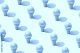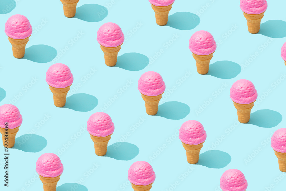 Trendy sunlight Summer pattern made with pink strawberry ice cream on bright light blue background. Minimal summer concept.