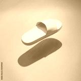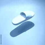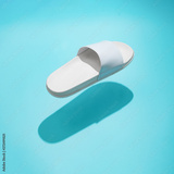 White summer slipper with bright blue background and sun shadow. Summer vacation concept.