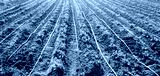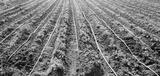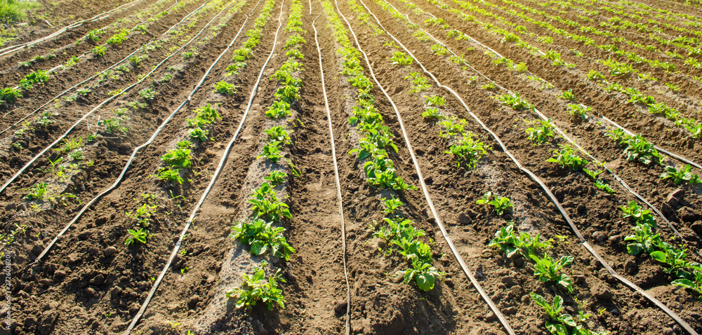 Young potatoes growing in the field are connected to drip irrigation. Agriculture landscape. Rural plantations. Farmland Farming. Selective focus